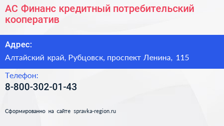 АС Финанс, кредитный потребительский кооператив по адресу Алтайский край, Рубцовск, проспект Ленина, 115 в дальнейшем Организация, размещена в следующих категориях: