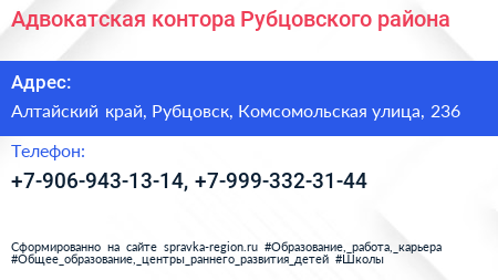 Адвокатская контора Рубцовского района по адресу Алтайский край, Рубцовск, Комсомольская улица, 236 в дальнейшем Организация, размещена в следующих категориях: