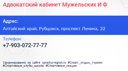 Адвокатский кабинет Мужельских И. Ф. по адресу Алтайский край, Рубцовск, проспект Ленина, 22 в дальнейшем Организация, размещена в следующих категориях: