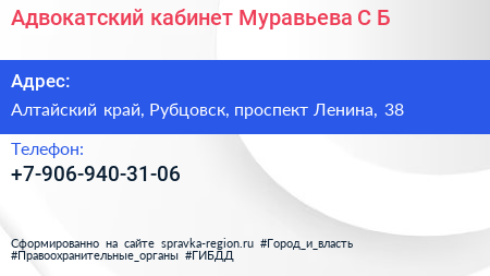 Адвокатский кабинет Муравьева С.Б. по адресу Алтайский край, Рубцовск, проспект Ленина, 38 в дальнейшем Организация, размещена в следующих категориях: