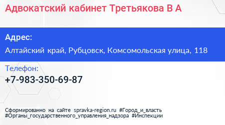 Адвокатский кабинет Третьякова В.А. по адресу Алтайский край, Рубцовск, Комсомольская улица, 118 в дальнейшем Организация, размещена в следующих категориях: