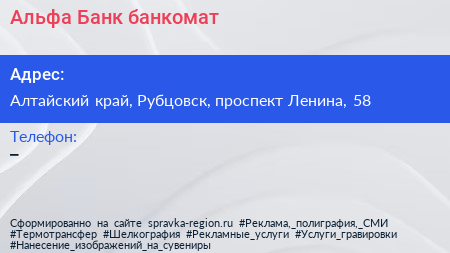 Альфа-Банк, банкомат по адресу Алтайский край, Рубцовск, проспект Ленина, 58 в дальнейшем Организация, размещена в следующих категориях: