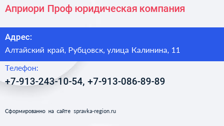 Априори Проф, юридическая компания по адресу Алтайский край, Рубцовск, улица Калинина, 11 в дальнейшем Организация, размещена в следующих категориях: