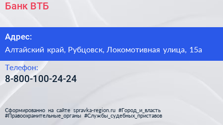 Банк ВТБ по адресу Алтайский край, Рубцовск, Локомотивная улица, 15а в дальнейшем Организация, размещена в следующих категориях: