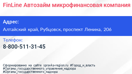 FinLine-Автозайм, микрофинансовая компания по адресу Алтайский край, Рубцовск, проспект Ленина, 206 в дальнейшем Организация, размещена в следующих категориях: