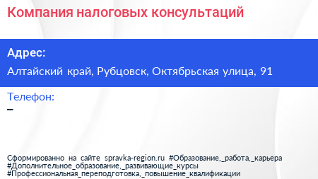 Компания налоговых консультаций по адресу Алтайский край, Рубцовск, Октябрьская улица, 91 в дальнейшем Организация, размещена в следующих категориях: