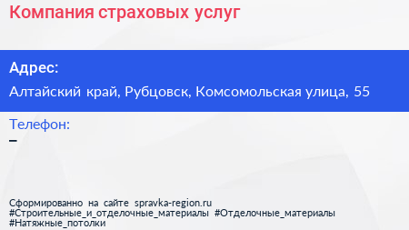 Компания страховых услуг по адресу Алтайский край, Рубцовск, Комсомольская улица, 55 в дальнейшем Организация, размещена в следующих категориях: