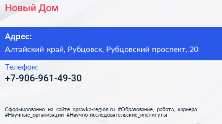 Новый Дом по адресу Алтайский край, Рубцовск, Рубцовский проспект, 20 в дальнейшем Организация, размещена в следующих категориях: