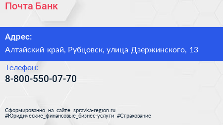 Почта Банк по адресу Алтайский край, Рубцовск, улица Дзержинского, 13 в дальнейшем Организация, размещена в следующих категориях: