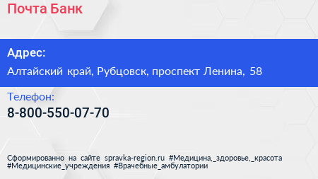 Почта Банк по адресу Алтайский край, Рубцовск, проспект Ленина, 58 в дальнейшем Организация, размещена в следующих категориях: