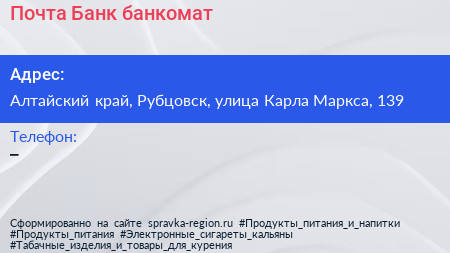 Почта Банк, банкомат по адресу Алтайский край, Рубцовск, улица Карла Маркса, 139 в дальнейшем Организация, размещена в следующих категориях: