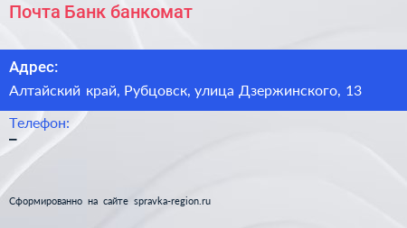 Почта Банк, банкомат по адресу Алтайский край, Рубцовск, улица Дзержинского, 13 в дальнейшем Организация, размещена в следующих категориях: