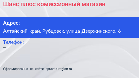 Шанс плюс, комиссионный магазин по адресу Алтайский край, Рубцовск, улица Дзержинского, 6 в дальнейшем Организация, размещена в следующих категориях:
