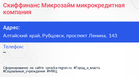 Скиффинанс-Микрозайм, микрокредитная компания по адресу Алтайский край, Рубцовск, проспект Ленина, 143 в дальнейшем Организация, размещена в следующих категориях: