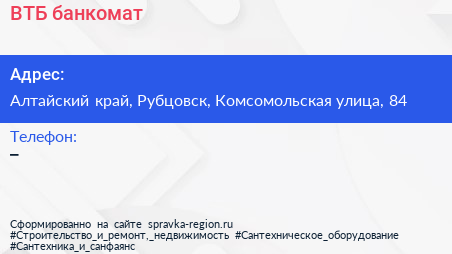 ВТБ, банкомат по адресу Алтайский край, Рубцовск, Комсомольская улица, 84 в дальнейшем Организация, размещена в следующих категориях: