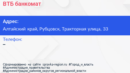 ВТБ, банкомат по адресу Алтайский край, Рубцовск, Тракторная улица, 33 в дальнейшем Организация, размещена в следующих категориях:
