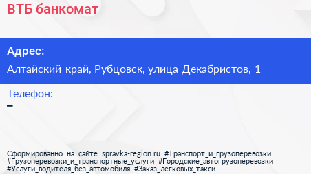 ВТБ, банкомат по адресу Алтайский край, Рубцовск, улица Декабристов, 1 в дальнейшем Организация, размещена в следующих категориях: