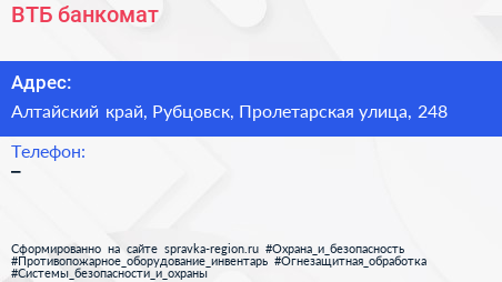 ВТБ, банкомат по адресу Алтайский край, Рубцовск, Пролетарская улица, 248 в дальнейшем Организация, размещена в следующих категориях: