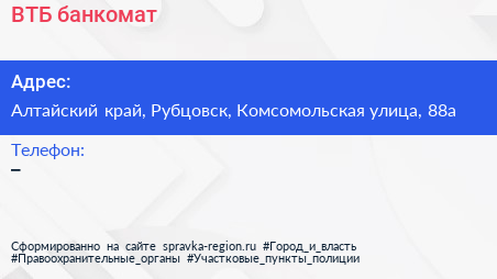 ВТБ, банкомат по адресу Алтайский край, Рубцовск, Комсомольская улица, 88а в дальнейшем Организация, размещена в следующих категориях:
