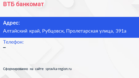 ВТБ, банкомат по адресу Алтайский край, Рубцовск, Пролетарская улица, 391а в дальнейшем Организация, размещена в следующих категориях: