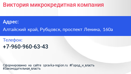 Виктория, микрокредитная компания по адресу Алтайский край, Рубцовск, проспект Ленина, 160а в дальнейшем Организация, размещена в следующих категориях: