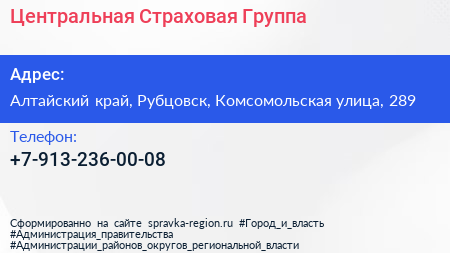 Центральная Страховая Группа по адресу Алтайский край, Рубцовск, Комсомольская улица, 289 в дальнейшем Организация, размещена в следующих категориях:
