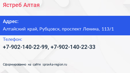 Ястреб Алтая по адресу Алтайский край, Рубцовск, проспект Ленина, 113/1 в дальнейшем Организация, размещена в следующих категориях: