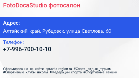 FotoDocaStudio, фотосалон по адресу Алтайский край, Рубцовск, улица Светлова, 60 в дальнейшем Организация, размещена в следующих категориях: