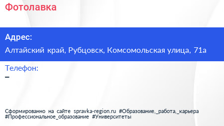 Фотолавка по адресу Алтайский край, Рубцовск, Комсомольская улица, 71а в дальнейшем Организация, размещена в следующих категориях: