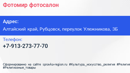 Фотомир, фотосалон по адресу Алтайский край, Рубцовск, переулок Улежникова, 3Б в дальнейшем Организация, размещена в следующих категориях: