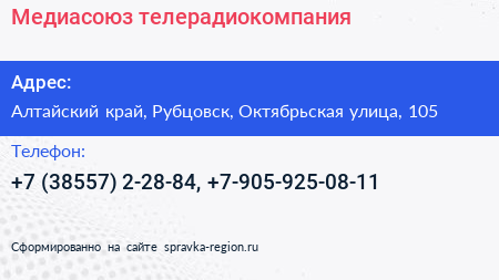 Медиасоюз, телерадиокомпания по адресу Алтайский край, Рубцовск, Октябрьская улица, 105 в дальнейшем Организация, размещена в следующих категориях: