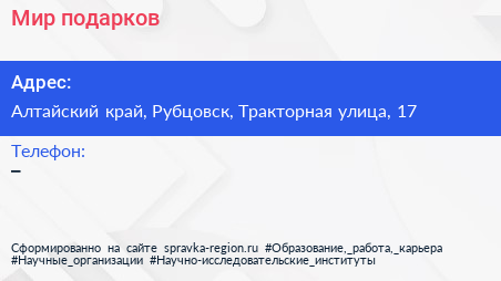 Мир подарков по адресу Алтайский край, Рубцовск, Тракторная улица, 17 в дальнейшем Организация, размещена в следующих категориях: