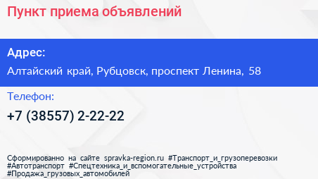 Пункт приема объявлений по адресу Алтайский край, Рубцовск, проспект Ленина, 58 в дальнейшем Организация, размещена в следующих категориях: