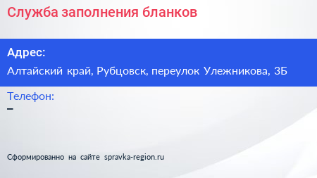 Служба заполнения бланков по адресу Алтайский край, Рубцовск, переулок Улежникова, 3Б в дальнейшем Организация, размещена в следующих категориях: