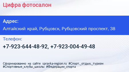 Цифра, фотосалон по адресу Алтайский край, Рубцовск, Рубцовский проспект, 38 в дальнейшем Организация, размещена в следующих категориях: