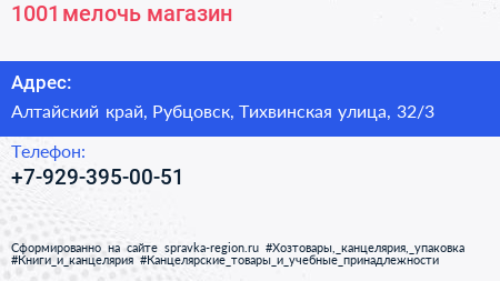 1001 мелочь, магазин по адресу Алтайский край, Рубцовск, Тихвинская улица, 32/3 в дальнейшем Организация, размещена в следующих категориях:
