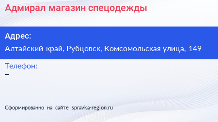 Адмирал, магазин спецодежды по адресу Алтайский край, Рубцовск, Комсомольская улица, 149 в дальнейшем Организация, размещена в следующих категориях: