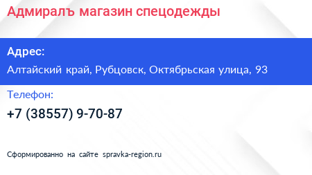 Адмиралъ, магазин спецодежды по адресу Алтайский край, Рубцовск, Октябрьская улица, 93 в дальнейшем Организация, размещена в следующих категориях: