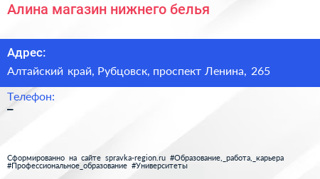 Алина, магазин нижнего белья по адресу Алтайский край, Рубцовск, проспект Ленина, 265 в дальнейшем Организация, размещена в следующих категориях: