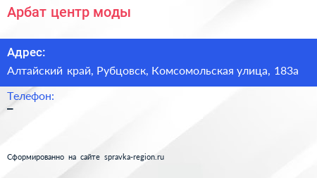 Арбат, центр моды по адресу Алтайский край, Рубцовск, Комсомольская улица, 183а в дальнейшем Организация, размещена в следующих категориях: