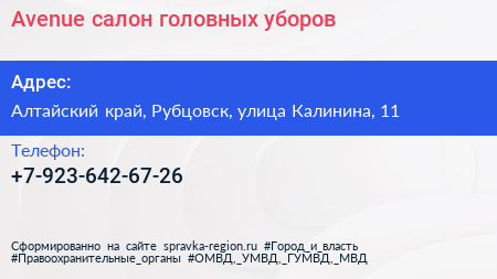 Avenue, салон головных уборов по адресу Алтайский край, Рубцовск, улица Калинина, 11 в дальнейшем Организация, размещена в следующих категориях: