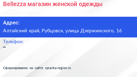 Bellezza, магазин женской одежды по адресу Алтайский край, Рубцовск, улица Дзержинского, 16 в дальнейшем Организация, размещена в следующих категориях: