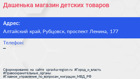 Дашенька, магазин детских товаров по адресу Алтайский край, Рубцовск, проспект Ленина, 177 в дальнейшем Организация, размещена в следующих категориях: