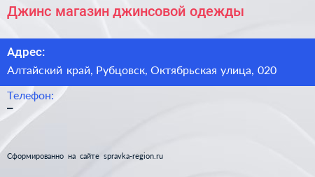 Джинс, магазин джинсовой одежды по адресу Алтайский край, Рубцовск, Октябрьская улица, 020 в дальнейшем Организация, размещена в следующих категориях: