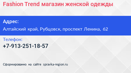 Fashion Trend, магазин женской одежды по адресу Алтайский край, Рубцовск, проспект Ленина, 62 в дальнейшем Организация, размещена в следующих категориях: