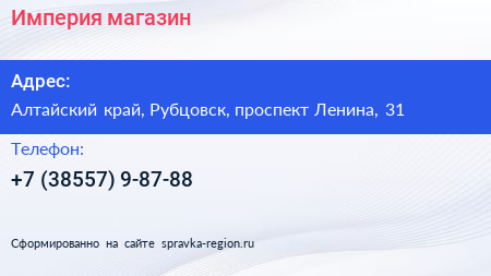 Империя, магазин по адресу Алтайский край, Рубцовск, проспект Ленина, 31 в дальнейшем Организация, размещена в следующих категориях: