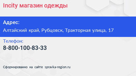 Incity, магазин одежды по адресу Алтайский край, Рубцовск, Тракторная улица, 17 в дальнейшем Организация, размещена в следующих категориях: