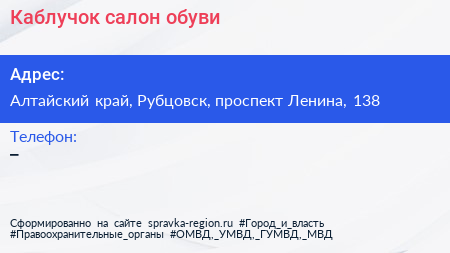 Каблучок, салон обуви по адресу Алтайский край, Рубцовск, проспект Ленина, 138 в дальнейшем Организация, размещена в следующих категориях:
