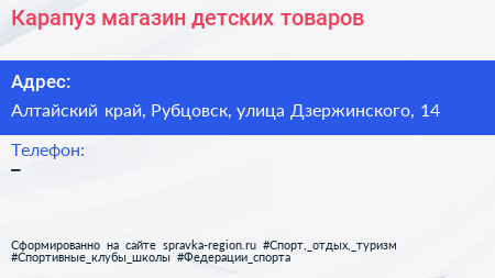 Карапуз, магазин детских товаров по адресу Алтайский край, Рубцовск, улица Дзержинского, 14 в дальнейшем Организация, размещена в следующих категориях: