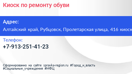 Киоск по ремонту обуви по адресу Алтайский край, Рубцовск, Пролетарская улица, 416 киоск в дальнейшем Организация, размещена в следующих категориях: